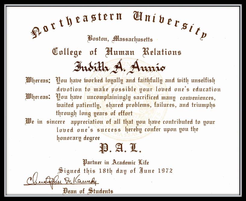 And yet, we have no real accounting of the contributions that this brings to our society and culture. Or do we? I was shocked, I have to say, when a few years ago my husband and I volunteered to go through several boxes and scan old pictures as a gift to my parents and came across this recognition conferred by Northeastern University to my mother from the College of Human Relations: