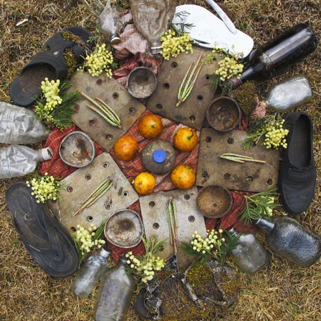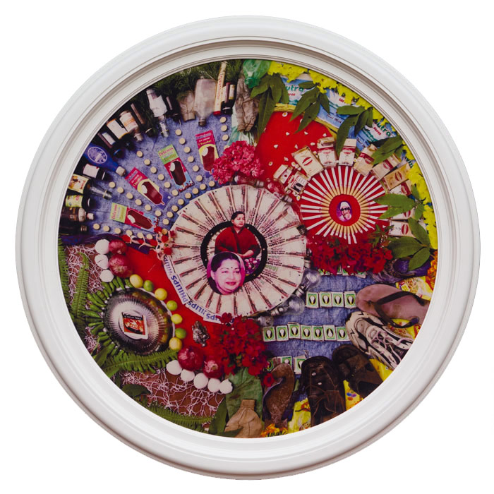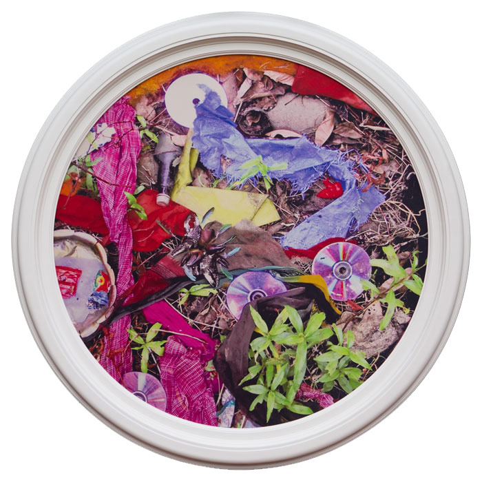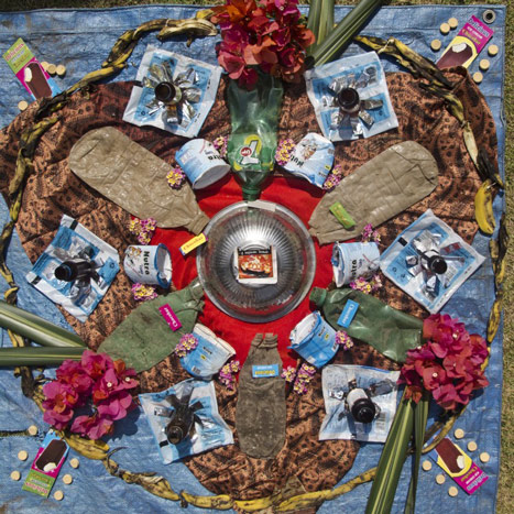 Like Suzanne, Ramsay shows you where to look among the garbage and the flowers. Like Cohen, he resolutely refuses to be a passive observer. There is no Emersonian all-seeing Eye to be found here, no patient wildlife photographer hiding motionless in a bluff, seemingly embarrassed to be human. All to the contrary. Ramsay is a part of this world and he knows it. As such, he interacts with his environment fearlessly and, at times, perhaps recklessly—even irreverently. In the works that comprise Harmonia Hindi, Ramsay doesn’t just gaze at the refuse of a consumer culture gone haywire, he actually plays with the garbage and the flowers, arranging them into intricate patterns and gorgeous designs—which are, incidentally, strikingly reminiscent of the sand mandalas carefully constructed (and then destroyed) by Tibetan Buddhist monks.