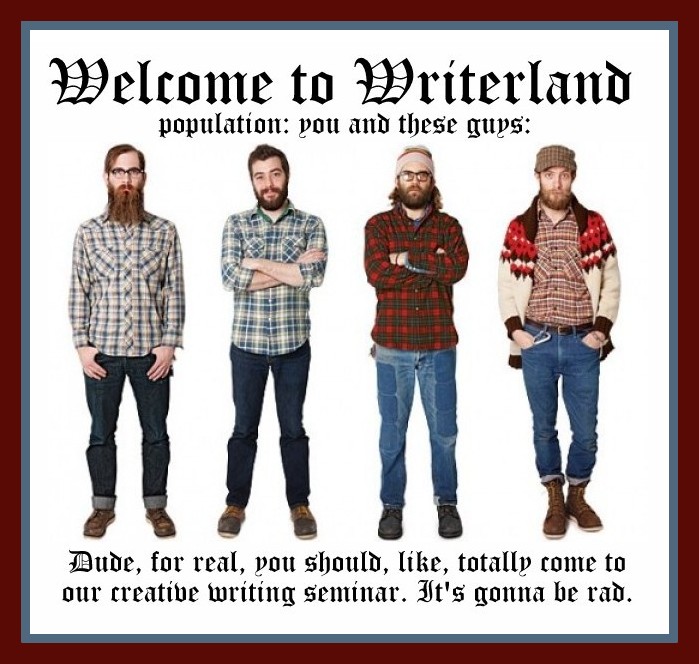 2. You get sucked into Writerland. If you start describing yourself as a writer at dinner parties and family functions, you’re gonna get sucked, sooner or later, into a strange parallel universe called Writerland. Before you know it, you’ll be going to creative writing seminars and publishing your shit in obscure literary journals no one reads. Mark my words: Writerland will distort and eventually destroy your style. One day you’ll wake up and realize that you’re only writing for other writers, when you really ought to be writing for intelligent readers. But then it’ll be too late: your writing will have already become one big, long inside joke that only the cool kids can understand. Remember Nassim Nicholas Taleb’s wise words in The Bed of Procrustes concerning the high costs we, as a society, pay for hyper-specialization: “architects build to impress other architects; models are thin to impress other models; academics write to impress other academics; filmmakers try to impress other filmmakers; painters impress art dealers; but authors who write to impress book editors tend to fail.”